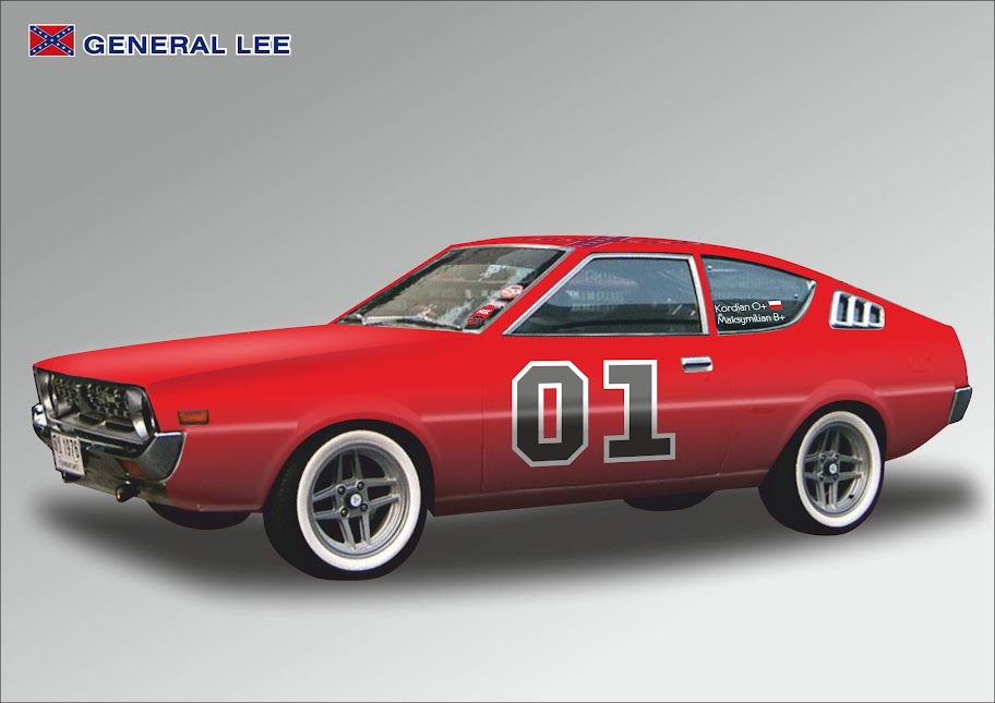 oraz celeste jako ...dodge challenger - General Lee z "Diuków Hazardu". Tu tylko "01 po obu stronach i flaga Południa na dachu